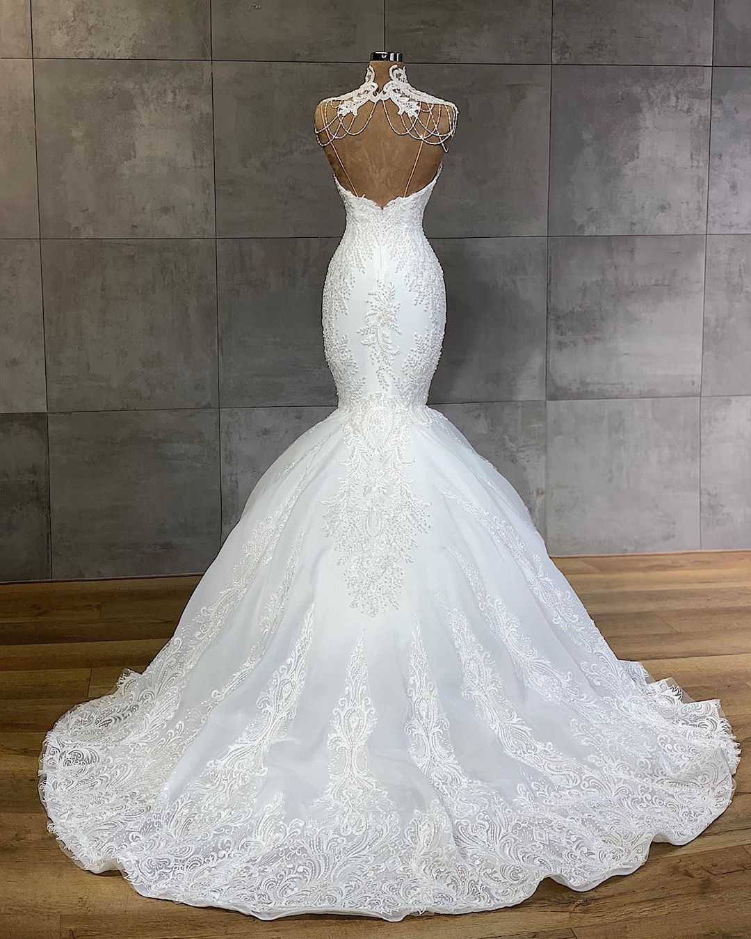 مدل لباس عروس ژورنالی بدون آستین ماهی با پارچه گیپور