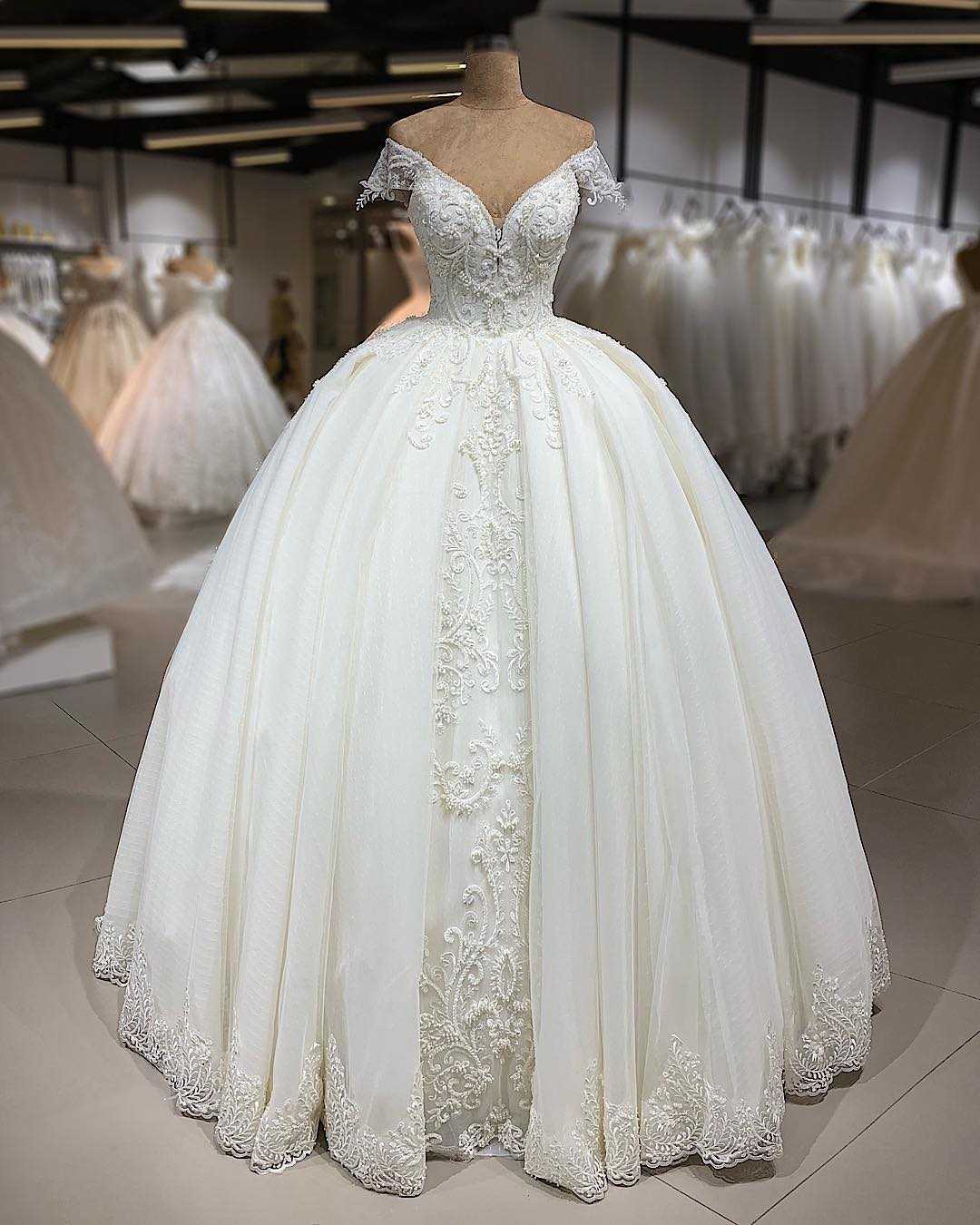 مدل لباس عروس ژورنالی با آستین سرخود با دامن پف دار