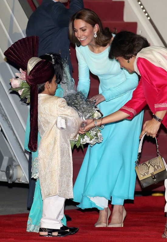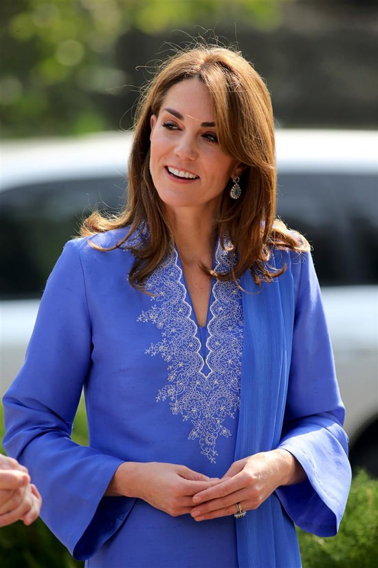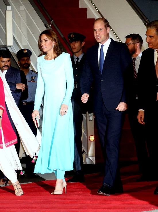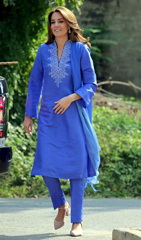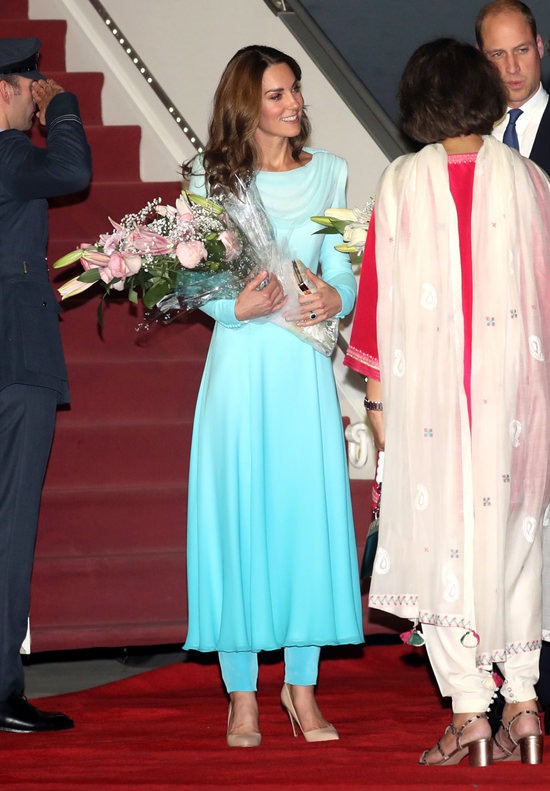 کیت میدلتون در اولین روز سفر خود به پاکستان و هنگام عزیمت از هواپیما با پوشیدن لباس طراح مورد علاقه انگلیسی خود، یک لباس متناسب با فرهنگ پاکستانی به تن دارد که شامل یک شلوار و یک پیراهن است. پوشیدن این لباس توسط کیت میدلتون این پیام را به همراه دارد که : “من از انگلیس به عنوان میهمان به خانه شما آمده ام و از نزدیک شدن به شما افتخار می کنم.”