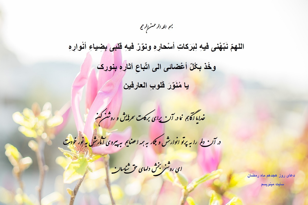 اللهمّ نَبّهْنی فیهِ لِبَرَکاتِ أسْحارِهِ ونوّرْ فیهِ قلبی بِضِیاءِ أنْوارِهِ وخُذْ بِکُلّ أعْضائی الى اتّباعِ آثارِهِ بِنورِکَ یا مُنَوّرَ قُلوبِ العارفین.خدایا آگاهم نما در آن براى برکات سحرهایش و روشن کن در آن دلم را به پرتو انوارش و بکار به همه اعضایم به پیروى آثارش به نور خودت اى روشنى بخش دلهاى حق شناسان.
