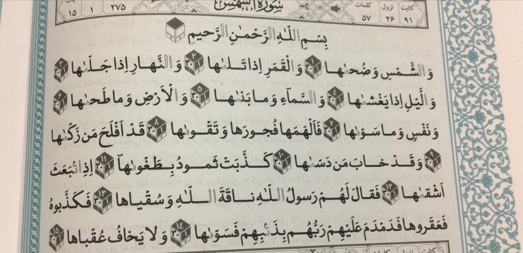 بِسْمِ اللَّهِ الرَّحْمَنِ الرَّحِیم وَالشَّمْسِ وَضُحَاهَا ﴿١﴾ وَالْقَمَرِ إِذَا تَلاهَا ﴿٢﴾ وَالنَّهَارِ إِذَا جَلاهَا ﴿٣﴾ وَاللَّیْلِ إِذَا یَغْشَاهَا ﴿٤﴾ وَالسَّمَاءِ وَمَا بَنَاهَا ﴿٥﴾ وَالأرْضِ وَمَا طَحَاهَا ﴿٦﴾ وَنَفْسٍ وَمَا سَوَّاهَا ﴿٧﴾ فَأَلْهَمَهَا فُجُورَهَا وَتَقْوَاهَا ﴿٨﴾ قَدْ أَفْلَحَ مَنْ زَکَّاهَا ﴿٩﴾ وَقَدْ خَابَ مَنْ دَسَّاهَا ﴿١٠﴾ کَذَّبَتْ ثَمُودُ بِطَغْوَاهَا ﴿١١﴾ إِذِ انْبَعَثَ أَشْقَاهَا ﴿١٢﴾ فَقَالَ لَهُمْ رَسُولُ اللَّهِ نَاقَةَ اللَّهِ وَسُقْیَاهَا ﴿١٣﴾ فَکَذَّبُوهُ فَعَقَرُوهَا فَدَمْدَمَ عَلَیْهِمْ رَبُّهُمْ بِذَنْبِهِمْ فَسَوَّاهَا ﴿١٤﴾ وَلا یَخَافُ عُقْبَاهَا ﴿١٥﴾